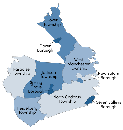 The 196th Legislative District includes the townships of Dover (voting precincts 1,3, and 4), Heidelberg, Jackson, North Codorus, Paradise and West Manchester and the boroughs of Dover, New Salem and Spring Grove.